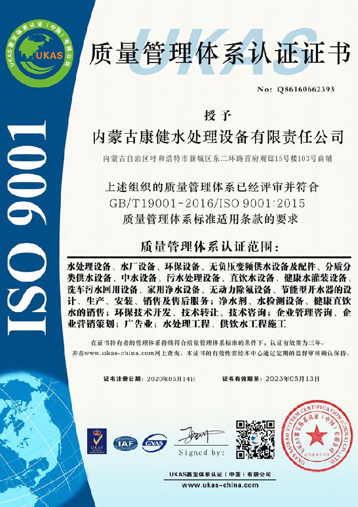 - 內(nèi)蒙古康健水處理設(shè)備有限責(zé)任公司是專業(yè)生產(chǎn)制造水處理設(shè)備、飲料設(shè)備、奶設(shè)備、殺菌設(shè)備、灌裝設(shè)備五大系列90余種配套產(chǎn)品。在反滲透、超濾、納濾、EDI模塊、等膜分離領(lǐng)域有著雄厚的技術(shù)實(shí)力,同時(shí)在水廠設(shè)計(jì)、中水回用、污水處理、分質(zhì)供水、無負(fù)壓變頻供水、鍋爐軟化水設(shè)備等領(lǐng)域有完善的技術(shù)團(tuán)隊(duì)和營銷網(wǎng)絡(luò)。公司坐落在遼闊大草原上美麗的首府——呼和浩特,是內(nèi)蒙古自治區(qū)唯一一家具有自主生產(chǎn)能力的企業(yè)。 “上善若水,水利萬物而不爭”康健水工自成立以來,始終堅(jiān)持“改善水質(zhì)、造福人類、服務(wù)社會(huì)、產(chǎn)業(yè)報(bào)國”的企業(yè)信條,以致力于開創(chuàng)人類綠色健康生活為己任,秉承“關(guān)愛生命、責(zé)任至上”的企業(yè)宗旨,成就了享譽(yù)四方的國內(nèi)知名水處理企業(yè)。 水是生命的源泉、工業(yè)的血液、城市的命脈。水是不可替代的寶貴資源。節(jié)約用水,關(guān)注點(diǎn)滴 為節(jié)約水資源貢獻(xiàn)一份力量, 健康飲水,利在當(dāng)代,功在千秋! 只有在這里,才能領(lǐng)會(huì)水的精髓;只有在這里,才...
